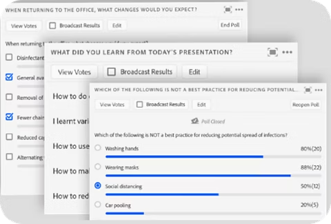 Persistent, reusable polls [multi-choice, multi-answer, short answers] & effortless quiz creation, real-time results, leader boards, proctoring dashboard & post session reports.