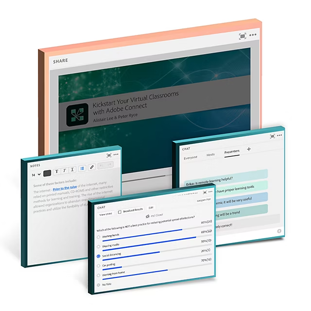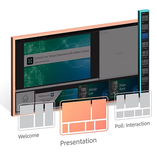 Create storyboards to guide participants' visual attention to where you want on your stage. Once the perfect virtual stage is ready, light it up with - images, multi-media, interactive courses, polls, quizzes, chats, or notes.