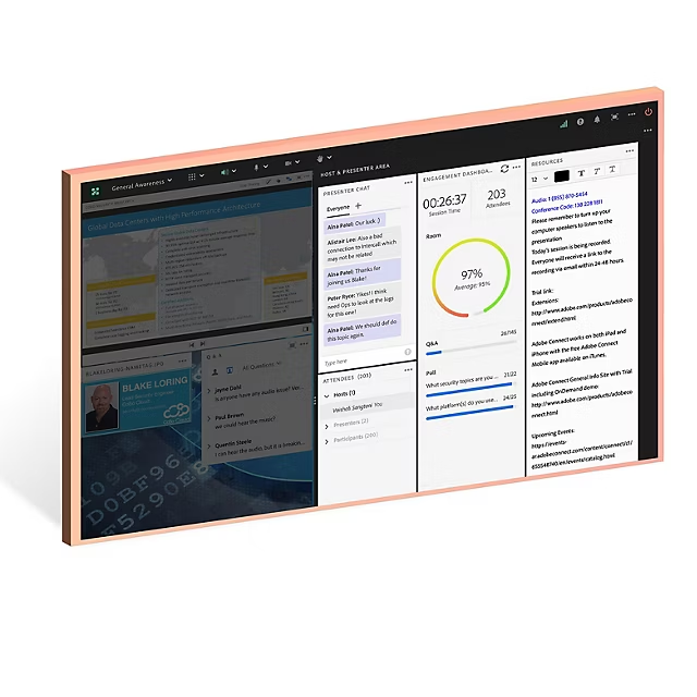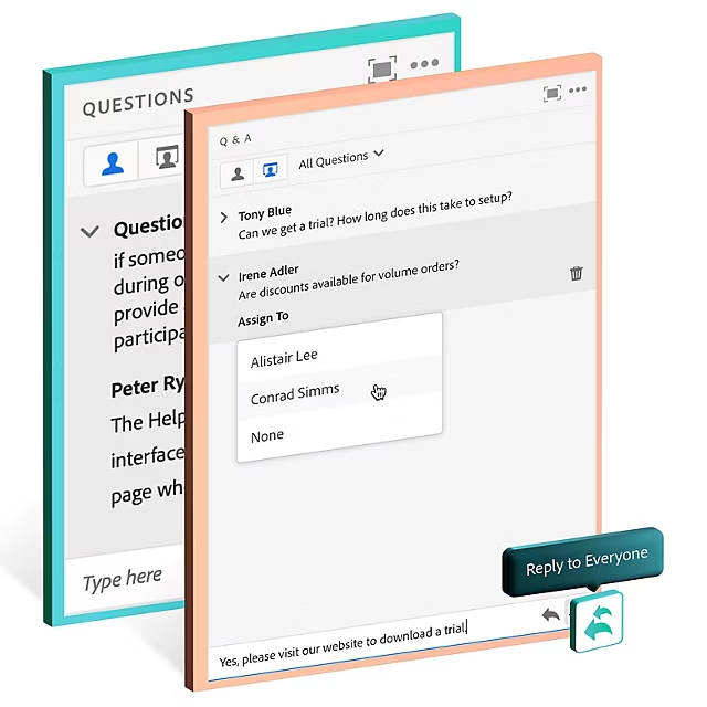 Use a Q&A Pod to allow complete control over the visibility of questions, answers, and participant identities. Manage hundreds of questions in large webinars efficiently by assigning it to the right expert in the room.