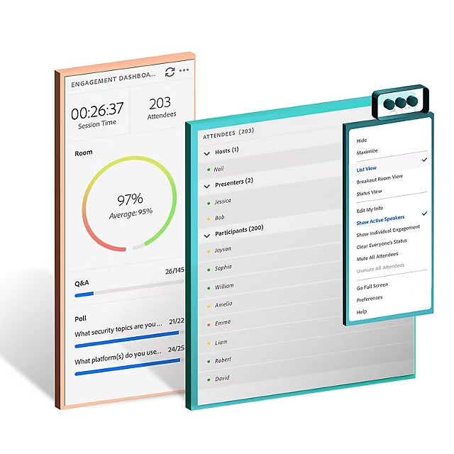 Virtual backstage for multiple hosts, presenters, and producers to collaborate discreetly & effectively, as well as add/edit the onstage experience on the fly. Have the attendee list, agenda, notes, presenter's chat, engagement dashboard, and presenter view of the moderated chat (Q&A Pod) available in this backstage area.