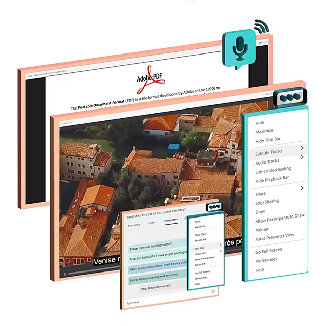 Leverage the accessible design provided by Adobe Connect webinar software to reach millions of individuals with visual, auditory, or mobility impairments. Make use of our newest webinar services and features such as support for embedded MP4 subtitles and multiple audio tracks, including foreign language and descriptive audio, for participants with a hearing impairment.