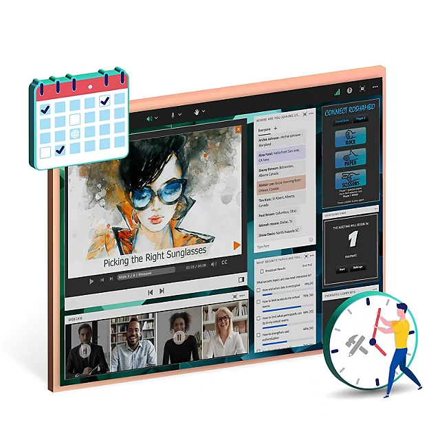 Hosts, presenters & participants can just 'walk-in' to persistent reusable rooms set up ahead of time. You can create and then reuse polls, quizzes, and other content for a different audience or at a different time.