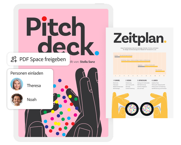 Text und Bilder lassen sich direkt bearbeiten und Projekte dadurch schneller voranbringen. Erstellt Brand-Kits oder Kampagnenpakete, indem ihr PDF-Dateien kombiniert.