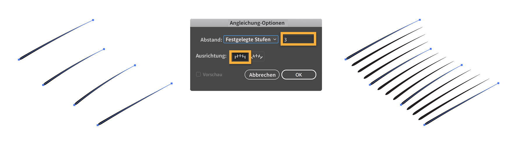Tracie arbeitet größtenteils mit Schraffuren, um unterschiedlich starke Schattierungen zu erzeugen. Zuerst zeichnet sie einige Konturen mit einem ihrer Pinsel. Mit dem Angleichen-Werkzeug („Objekt > Angleichen > Angleichung-Optionen“ und dann „Objekt > Angleichen > Erstellen“) erstellt sie einen Satz paralleler Konturen. Anschließend erstellt sie einen weiteren Satz paralleler Konturen, dieses Mal in einem anderen Winkel (wieder mit dem Angleichen-Tool). Durch Übereinanderlegen der beiden Kontursätze entsteht eine Kreuzschraffur.