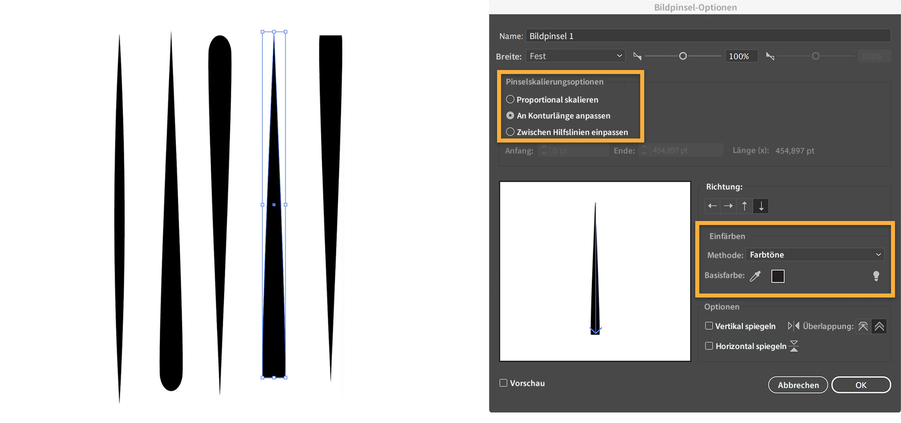 Wenn sie mit der Form zufrieden ist, speichert sie sie als neuen Bildpinsel (Fenster > Pinsel > Neuer Pinsel) und setzt die Methode zum Einfärben auf „Farbtöne“. Diese Einstellung ermöglicht es ihr, die Farbe des Pinsels später zu ändern.