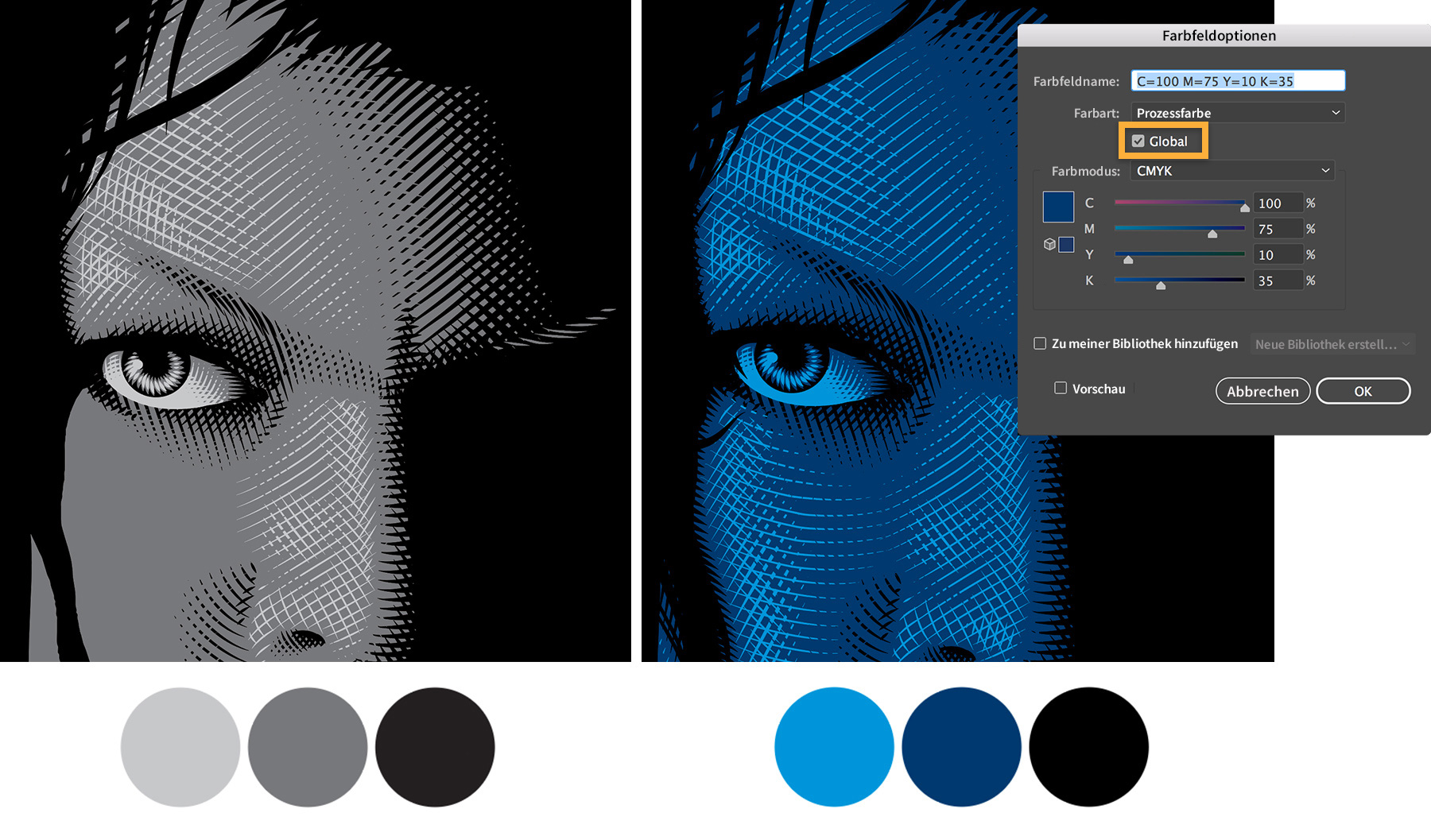 In den Farbfeldoptionen (Fenster > Farbfelder > Farbfeldoptionen) definiert sie alle diese Farben als „Global“. Sie kann so eine oder auch alle Farben später schneller ändern.