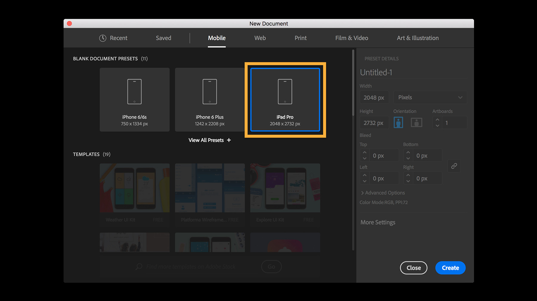 3. Nachdem du eine Kategorie ausgewählt hast, kannst du aus zahlreichen Presets für gängige Dokumentenarten wählen. Ein Preset ist ein leeres Dokument mit vordefinierten Abmessungen und Einstellungen. Nachdem du z. B. „Mobil“ ausgewählt hast, kannst du auf das Preset „iPad Pro“ klicken und gleich mit dem Design loslegen.