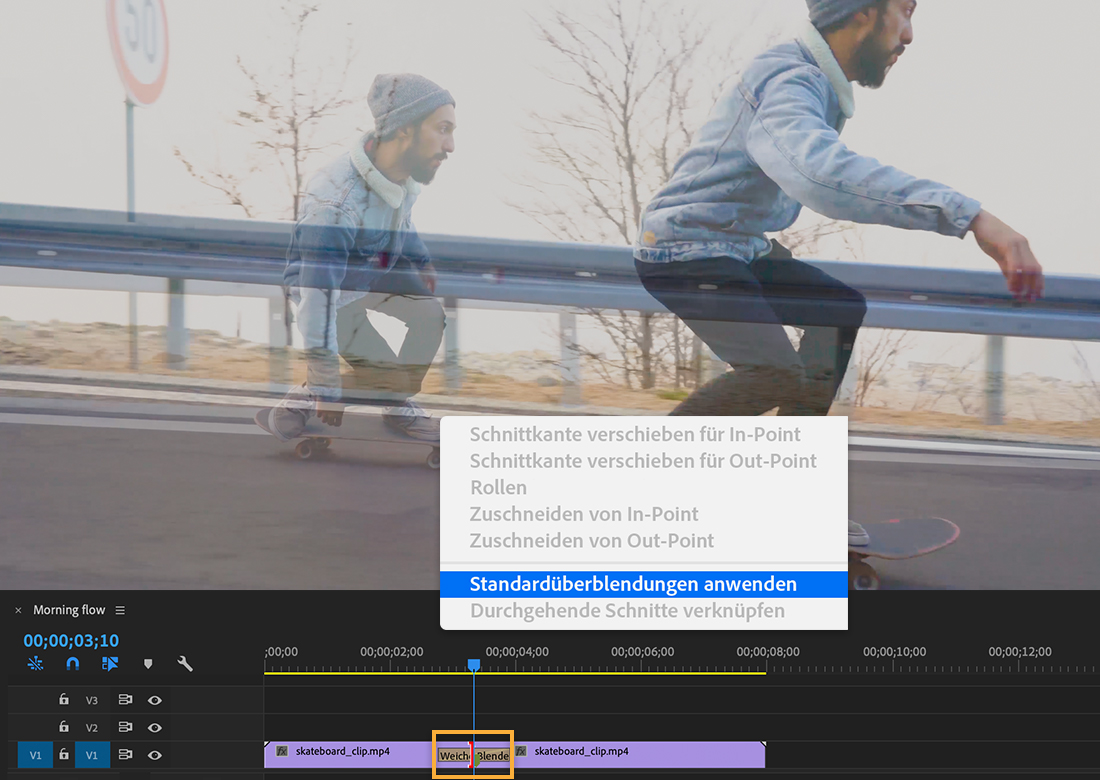 Um einen fließenden Übergang zu erstellen, macht Kendall einen Rechtsklick bzw. Ctrl-Klick zwischen den beiden Clips und wählt „Standardüberblendungen anwenden“. Damit wird eine weiche Blende erzeugt.