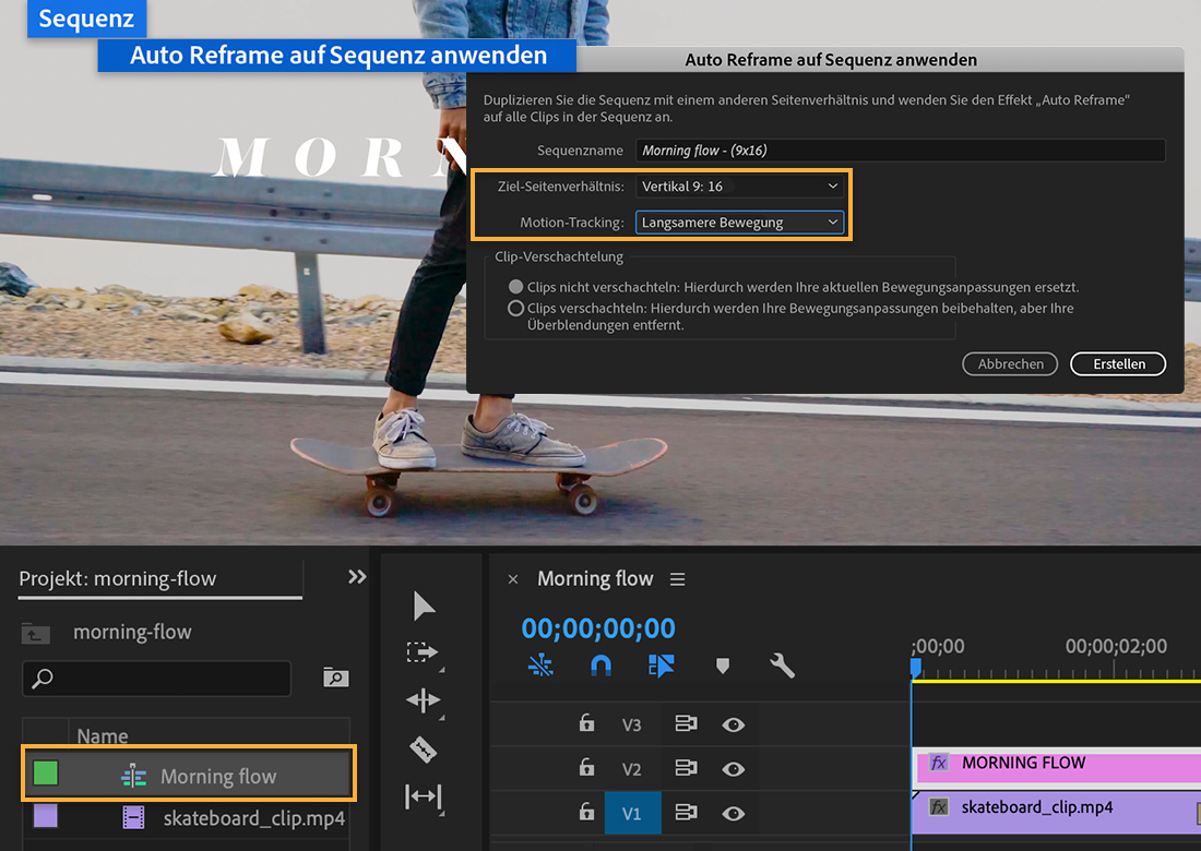 Kendall drückt die Leertaste, um eine Vorschau des Videos anzusehen. Sie klickt im Projektfenster auf die Sequenz „Morning Flow“ und wählt „Sequenz > Auto Reframe auf Sequenz anwenden“. Sie setzt das „Seitenverhältnis“ auf „Vertikal 9:16“, um das passende Format für Instagram zu erhalten. Als „Bewegungsvorgabe“ wählt sie „Langsamere Bewegung“, da auch die Bewegung im Clip eher langsam ist.