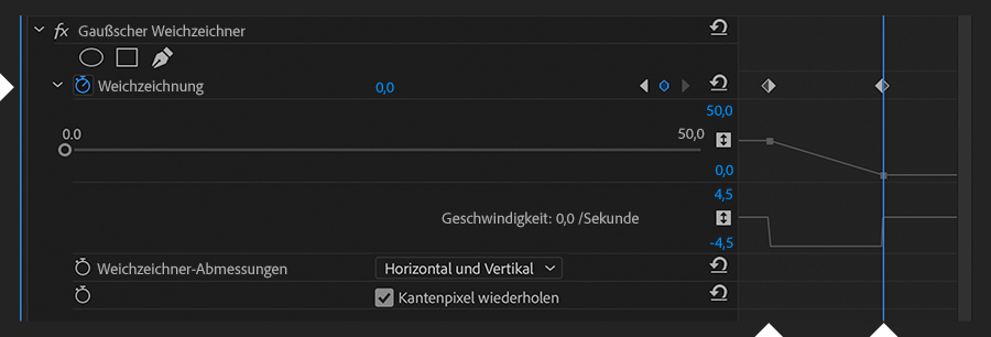 Zur Simulation der Schärfenverlagerung setze in jedem Clip für die Eigenschaft „Weichzeichnung“ zwei Keyframes mit demselben Abstand zwischen null und einem beliebigen Wert. Tausche die Reihenfolge der Keyframe-Werte im unteren Clip aus. Wenn die Werte im oberen Clip zum Beispiel 0 und 25 lauten, lege für den unteren Clip die Werte 25 und 0 fest. Bei der Wiedergabe der Sequenz verlagert sich der Fokus vom Hintergrund in den Vordergrund oder umgekehrt.