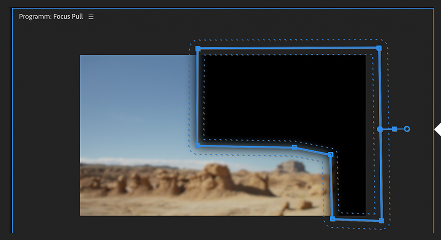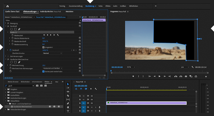 Öffne den Arbeitsbereich „Bearbeitung“. Wende den Effekt „Gaußscher Weichzeichner“ (Umschalt+7) auf Spur V1 im Schnittfenster an. Rufe das Bedienfeld „Effekteinstellungen“ auf (Umschalt+5). Erhöhe den Wert für „Weichzeichnung“, um den Effekt deutlich zu sehen. Wähle die Option „Kantenpixel wiederholen“ aus, um saubere Kanten zu erhalten. Wähle im Abschnitt „Deckkraft“ eines der drei Formwerkzeuge für Masken aus. Ziehe im Programmmonitor eine Maske um das Objekt auf, das für die Schärfeverlagerung isoliert werden soll. In unserem Beispiel befindet sich dieser Bereich im Vordergrund. Wenn sich das Motiv innerhalb des Frames bewegt, musst du Keyframes für den Maskenpfad setzen, damit die Maske dem Motiv folgt. Klicke zum Schluss auf „Umgekehrt“.