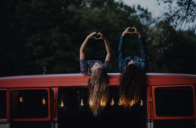 Two girls laying on top of a camping van making hearts with their fingers during blue hour.
