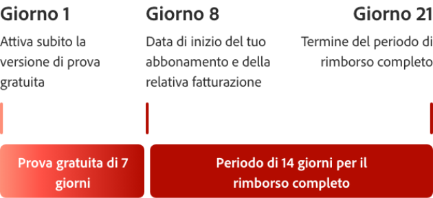 Prova Acrobat Pro gratuitamente per 7 giorni. Se dovessi avere bisogno di più tempo per provare tutte le funzionalità, avrai altri 14 giorni per annullare la tua iscrizione e ricevere un rimborso completo.