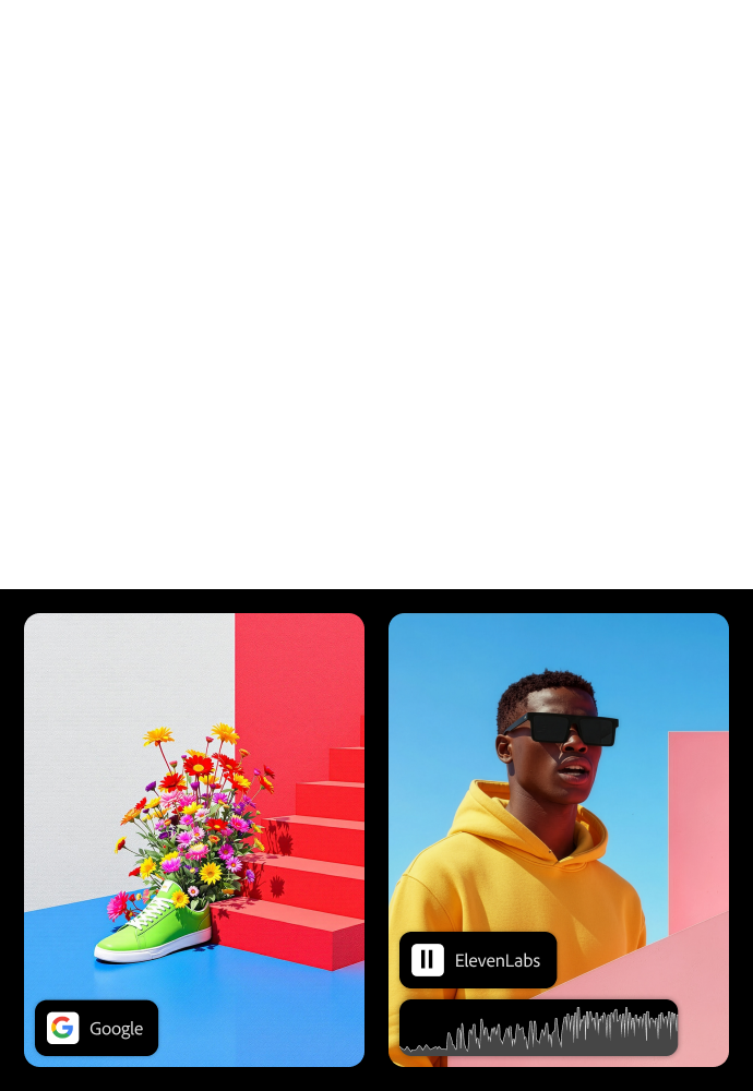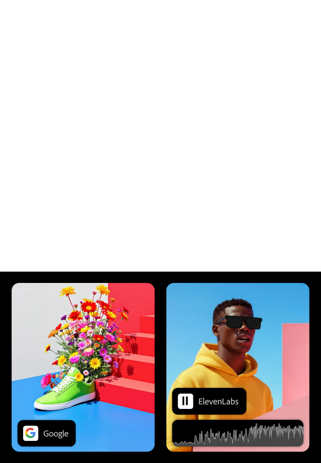 Genera i tuoi contenuti a partire da modelli di IA eccellenti realizzati da Adobe, Google, OpenAI, ElevenLabs e altri partner.