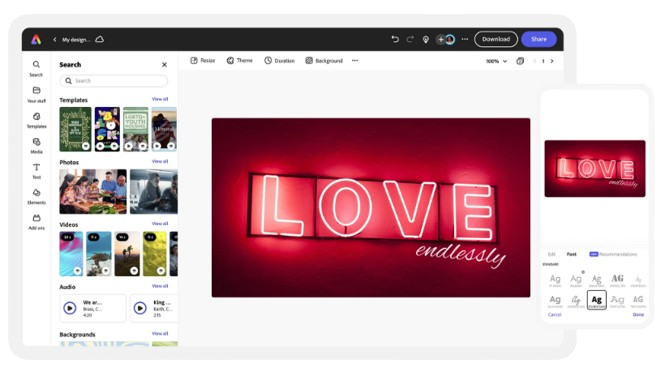 You can start your project from the Adobe Stock royalty-free photo, video, or audio collection.