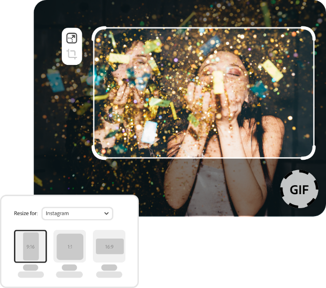 根据偏好,给您的GIF动图选择一种长宽比,使其在数字平台上取得最佳效果。从正方形、风景画幅或人像画框中进行选择,然后拖动您的GIF动图使其适应新形状。