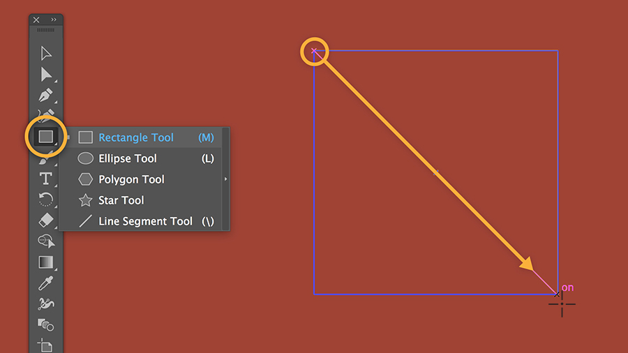您可以使用 Illustrator 中的矢量图形工具创建简单图形。点击矩形工具图标查看所有图形工具,然后选择“Rectangle Tool”(矩形工具)。在画板上拖动鼠标绘制矩形。拖动鼠标时,请注意品红色对角参考线,该参考线表示您绘制的图形为出正方形。
