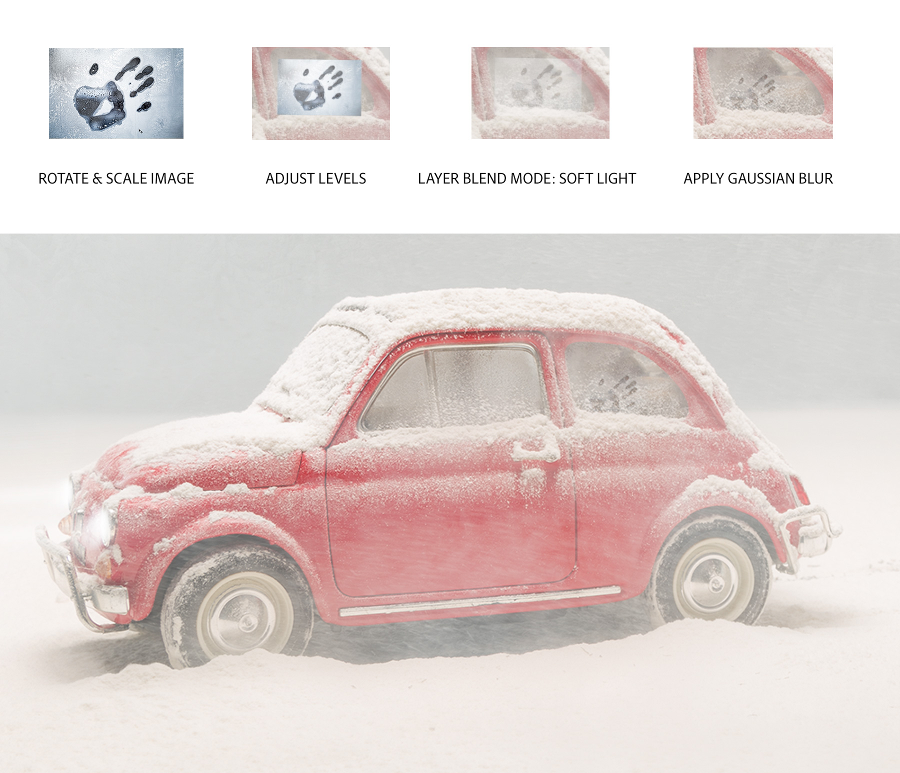 为了营造神秘感,Felix 在车子后窗添加了一个冷冰冰的手印。他首先旋转并缩放手印图片,然后将其移动到适合的位置。为了使手印和场景融合,他调整了手印图层的色阶并创建了一个剪贴蒙版,将混合模式设置为“Soft Light”(柔光),然后重新调整了色阶。接下来,他添加了一个图层蒙版,并使用一个不透明度较低的黑色笔刷进行描绘,以使手印图片的边缘和场景融合。最后,他应用高斯模糊来创造粗糙的效果,以匹配车窗上的冰雪场景。