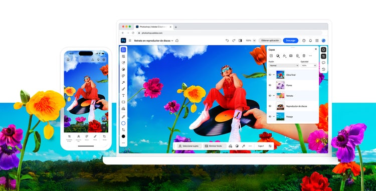 Cambia con fluidez entre el teléfono y la computadora con la nueva Photoshop para dispositivos móviles. Obtén el plan para web y dispositivos móviles de Photoshop, ya disponible en la aplicación para iPhone.