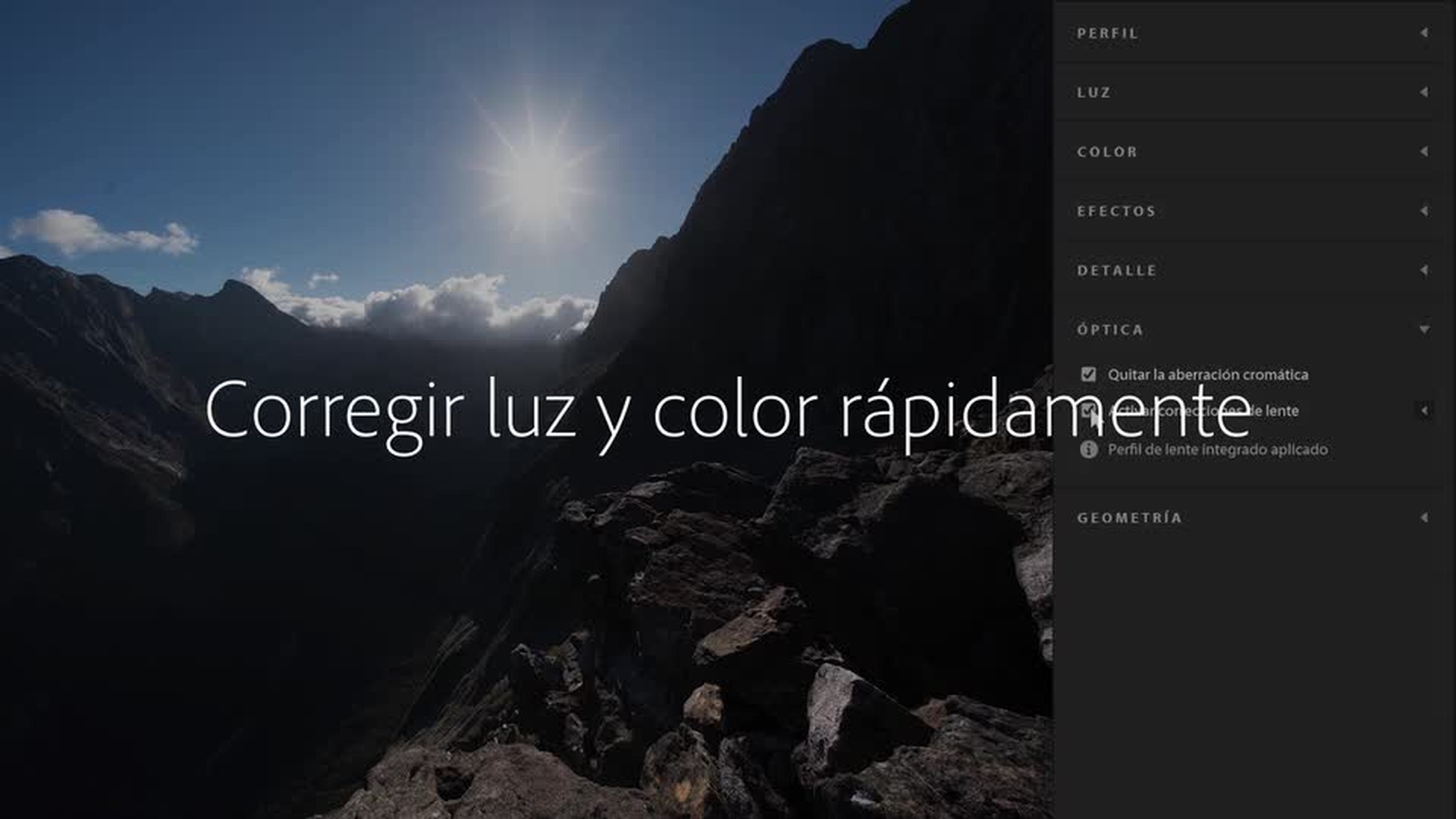 Crea la visión más hermosa de lo que viste en el campo. Descubre cómo aplicar correcciones de la lente, fijar la luz y el color, ajustar áreas específicas y eliminar defectos.