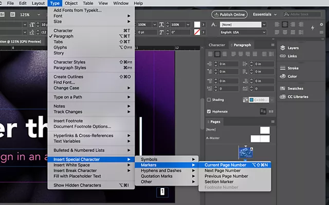 Adding page numbers will help you and your audience keep track of any sequentially paged documents. To insert page numbers, select Type from the main menu, then Insert Special Character, then Markers, and finally Current Page Number. InDesign will automatically number the slides.