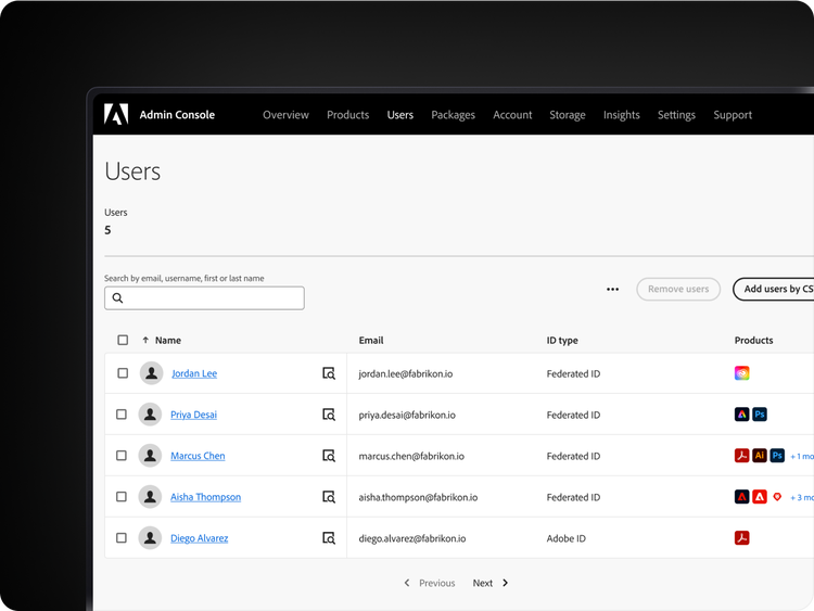 Add users and assign roles directly in the Adobe Admin Console, and get pooled storage that scales automatically as your team grows.