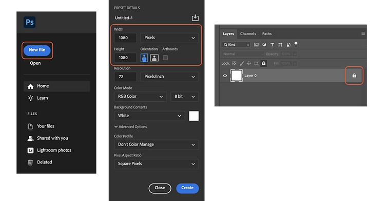 Your new document will prompt you to select some parameters. Most social media feeds today work well with square (1:1 aspect ratio) images. Let’s use an Instagram post as an example — post size will be 1080 x 1080px. Select a resolution of 72 pixels per inch, then click on the blue Create button at the bottom of the window. A higher resolution (150 or 300 pixels per inch) is fine as long as you make sure your canvas is a square 1:1 ratio. You can do this by selecting 1:1 (Square) from the drop-down menu on the top left of your screen. Click the small checkbox at the top of your screen to set your canvas size.