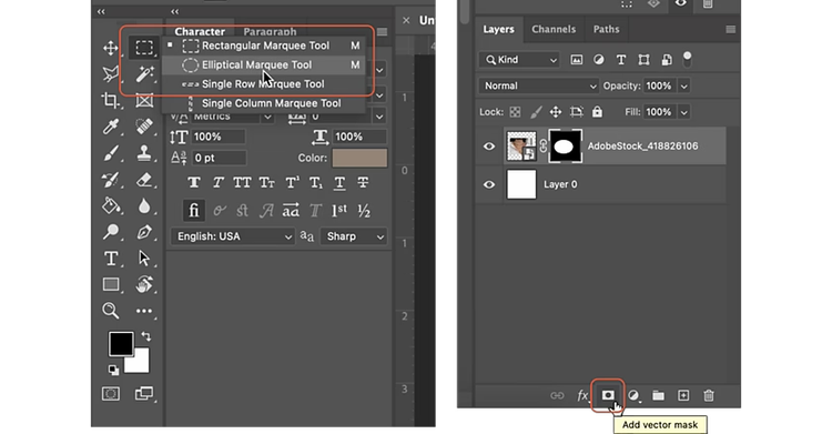 - Right-click the Rectangular Marquee tool to select the Elliptical Marquee from the drop-down menu.