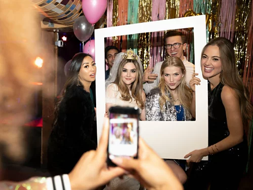 Deck out your backdrop with tissue paper chains, sequins, paper flowers made of ombre tissue, and accessories like hats or masks. Liven up birthday parties, baby showers, and bridal showers with fun portrait photography.
