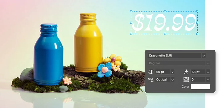 Once your image looks just right, take advantage of a versatile array of text editing options in Photoshop to add branding and price information to your pictures.