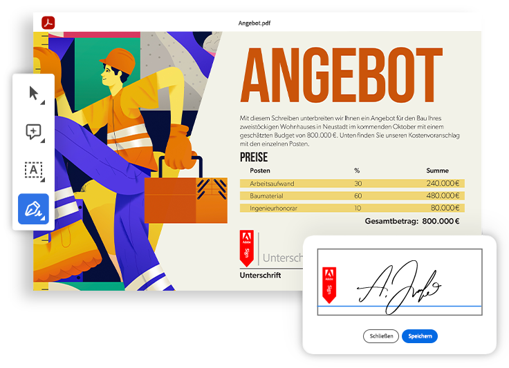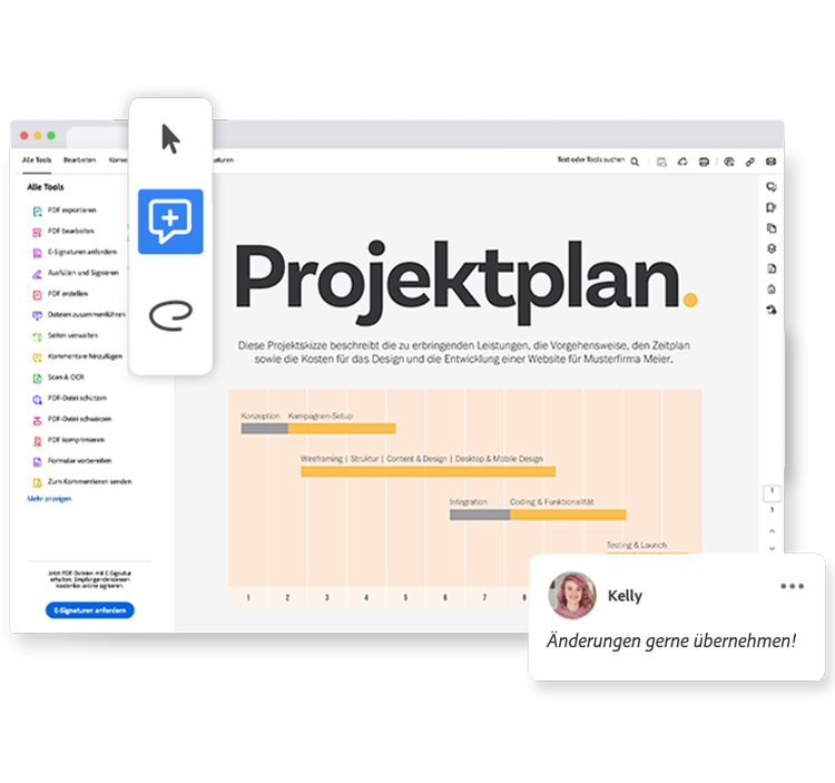 Acrobat umfasst jetzt weitere Funktionen für elektronische Signaturen, über die ihr Dokumente unterzeichnen oder Unterschriften anfordern könnt. Außerdem könnt ihr eine gemeinsame Vorlagenbibliothek mit häufig verwendeten Dateien oder eurem Logo erstellen.