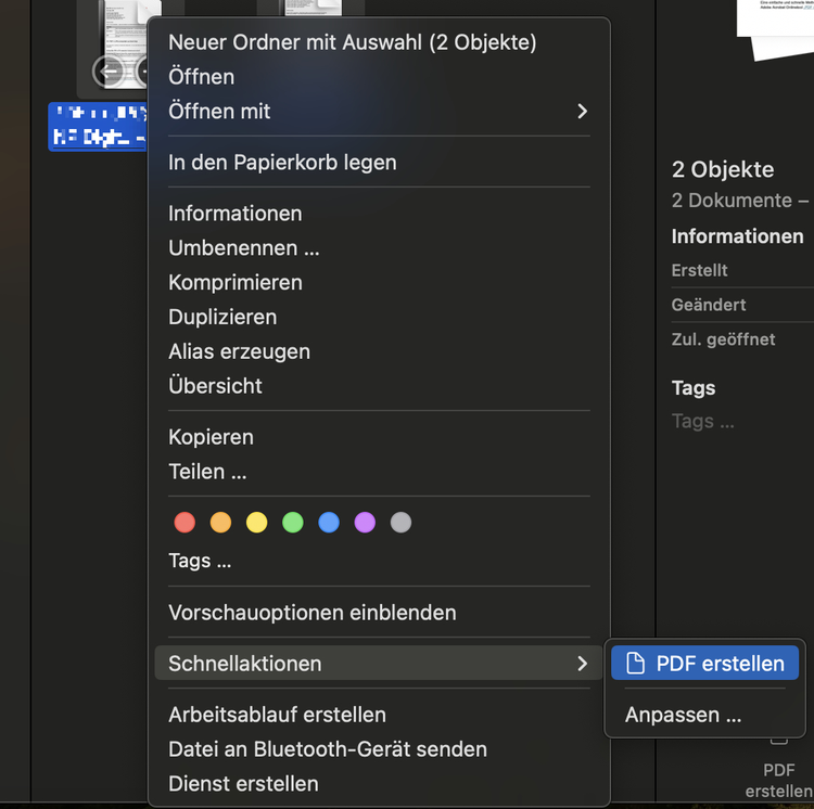 - Du hast statt den PDF-Dokumenten die Word-Dateien markiert: Mit Pages oder Word-Dateien steht die Schnellaktion „PDF erstellen“ nicht zur Verfügung. Prüfe daher noch einmal, ob du die richtigen Dokumente markiert hast.