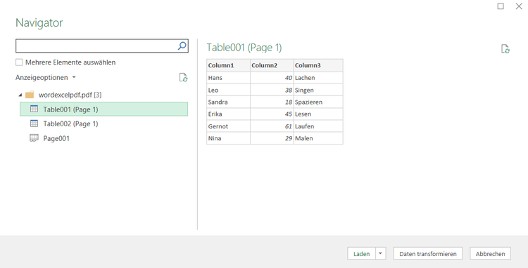 - Unter „Laden“ werden die Daten direkt in die Excel-Tabelle übernommen. Über „Daten transformieren“ kommst du zunächst in einen Zwischenbereich, in dem du die Daten vorbearbeiten kannst.