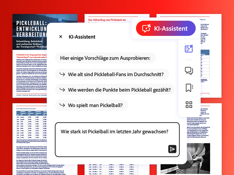 Der KI-Assistent von Acrobat beantwortet deine Fragen zum Dokument. Fasse den Inhalt eines Dokuments per Klick zusammen. Steigere die Produktivität anhand der gewonnenen Einblicke. Der KI-Assistent ist als Add-on zu Acrobat erhältlich. PRICE - ABM - AI Assistant for Acrobat {{small-tax-incl-label}} im {{annual-paid-monthly-plan}}.
