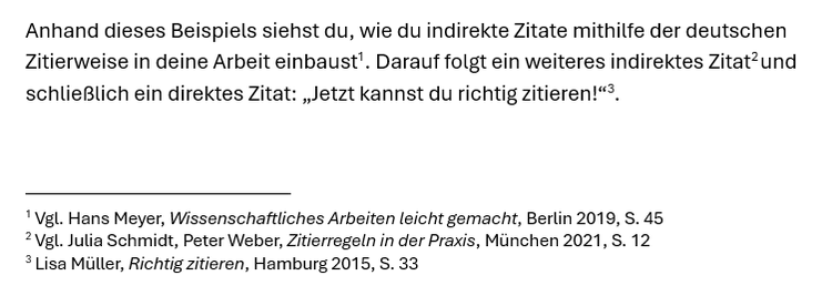 „Die deutsche Zitierweise bietet eine klare Struktur, bei der Fußnoten den Leser*innen ermöglichen, Quellen präzise nachzuvollziehen, ohne den Lesefluss zu unterbrechen. Sie erfordert jedoch Sorgfalt, da jedes Zitat exakt dokumentiert werden muss, um wissenschaftliche Transparenz und Nachvollziehbarkeit zu gewährleisten.“