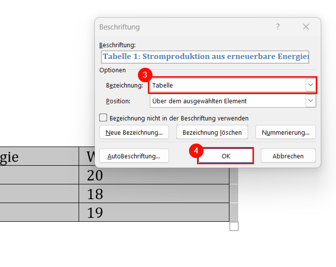 - Wähle bei „Bezeichnung“ „Tabelle“ aus. Falls es diesen Begriff nicht zur Auswahl gibt, kannst du ihn unter „Neue Bezeichnung“ anlegen. Schreibe dann den kompletten Titel der Tabelle in das Feld „Beschriftung“.