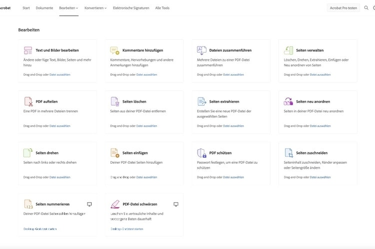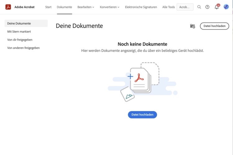 Du kannst über "Datei auswählen" mit allen Dokumenten arbeiten, die du bereits in Adobe Document Cloud gespeichert hast. Alternativ kannst du neue Dokumente hochladen, um sie zu bearbeiten. Eine Übersicht aller Möglichkeiten, PDF-Dateien zu bearbeiten, zu konvertieren und zu signieren, findest du hier. Willst du mehr über die Arbeit mit Dokumenten in Adobe Document Cloud wissen? Hier findest du eine ausführliche Anleitung und weitere Möglichkeiten.