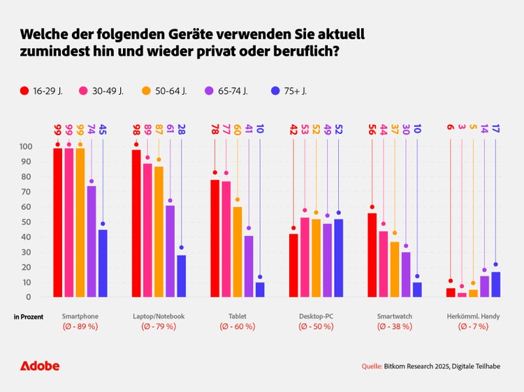 Digitale Technologien und mobile Geräte sind inzwischen in allen Altersgruppen angekommen, allerdings mit deutlichen Unterschieden in Nutzungstiefe und Kompetenz. Die Bitkom-Daten von 2025 zeigen, dass digitale Teilhabe kein reines Thema der Generation Z ist, sondern gesellschaftsweit gewünscht wird. Gleichzeitig berichten insbesondere ältere Nutzerinnen und Nutzer von Hürden wie Unsicherheit, fehlender Erfahrung oder technischer Überforderung: 45 Prozent der über 75-Jährigen geben an, Hemmungen bei der Nutzung digitaler Angebote zu haben.
