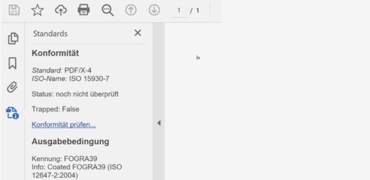 Die PDF-Einstellungen findest du, indem du in deinem geöffnetem PDF-Dokument links in der Spalte auf das Symbol "Standard" klickst. Unter "Konformität" neben "Standard" kannst du herauslesen, um welches Format es sich bei deiner PDF-Datei handelt.