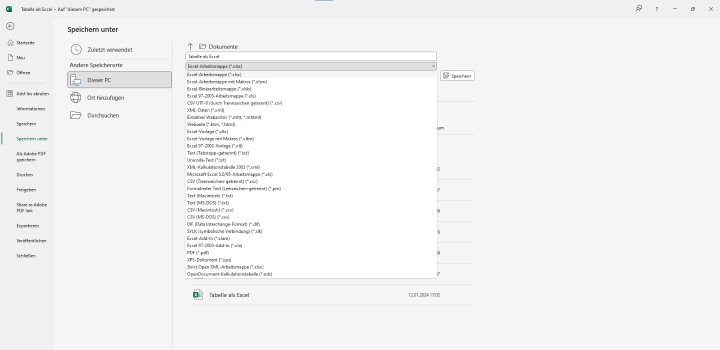 - Klicke auf "Datei" > "Speichern unter" und wähle dann als Dateiformat CSV aus.