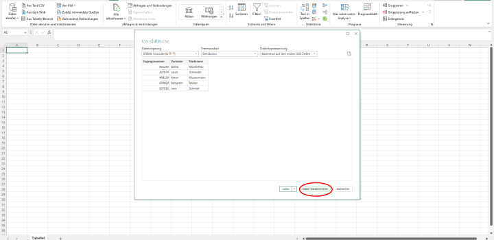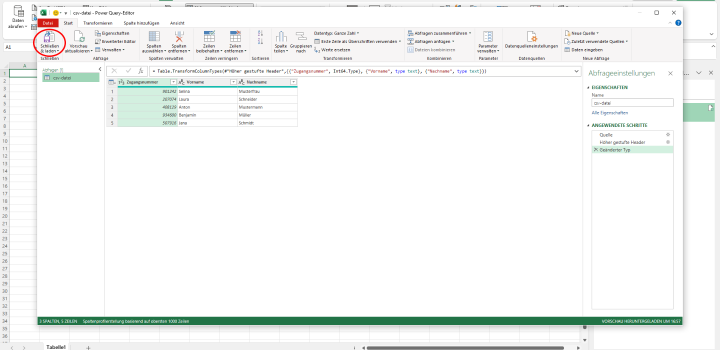 - Es öffnet sich ein weiteres Fenster, in dem du deine Tabellendaten editieren kannst. Wenn du fertig bist, klicke auf „Schließen & laden“. Nun kannst du deine Daten aus der CSV-Datei in Excel bearbeiten.