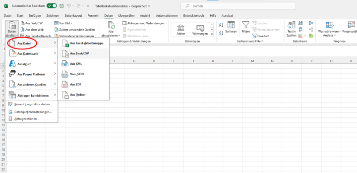 - Wähle "Daten abrufen" und dann „Aus Datei“ aus. Jetzt kannst du den Dateityp auswählen, den du importieren möchtest. Du kannst nicht nur CSV-Dateien in Excel öffnen, sondern so auch HTML-Dateien und Textdateien importieren.
