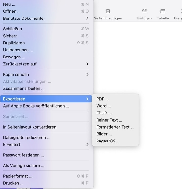 - Als Word exportieren: Klicke in der oberen Menüleiste auf „Ablage“, wähle „Exportieren“ und dann „Word“.