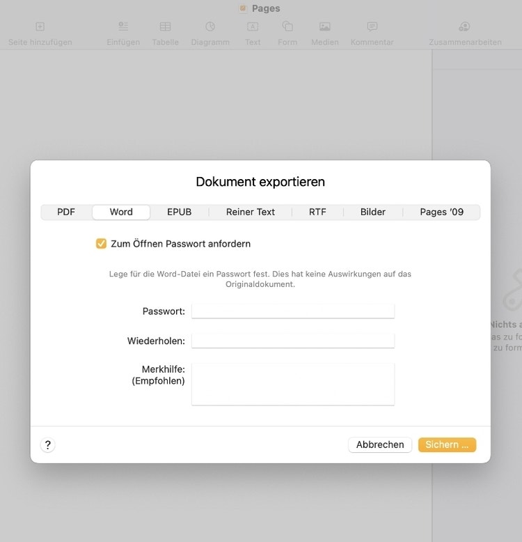 - Passwort anfordern (optional): Im Dialogfeld kannst du optional ein Passwort festlegen, um die Word-Datei zu schützen.