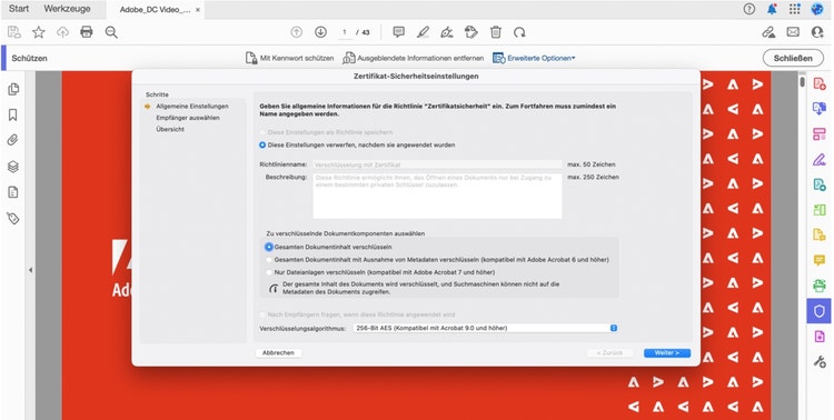 Mit Adobe Acrobat Pro kannst du dein PDF-Dokument mit einem Zertifikat verschlüsseln.
