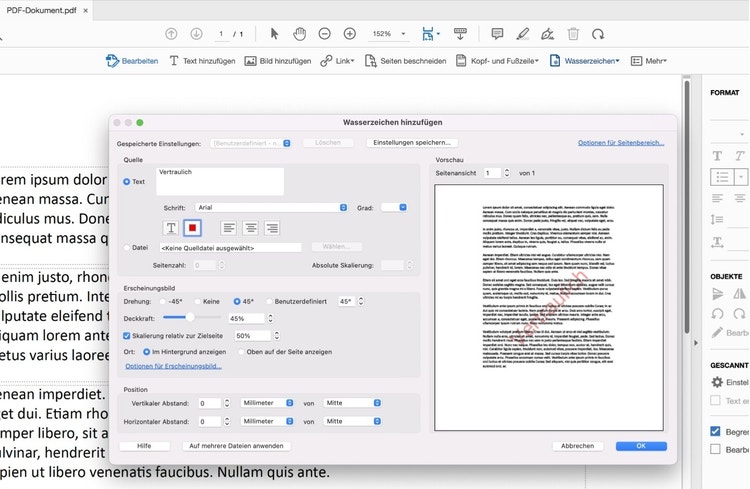 Ein Wasserzeichen kannst du ganz einfach in Acrobat erstellen. Dazu wählst du in der Bearbeitungsleiste den Befehl "Wasserzeichen". Du kannst einen Text eingeben und anschließend Position, Größe, Farbe, Neigung und Transparenz anpassen. Alternativ kannst du auch ein Bild als Wasserzeichen einbinden.