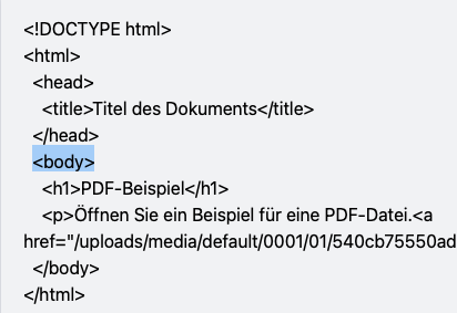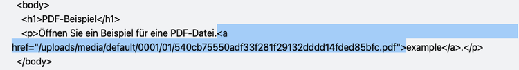 3. Wähle die Stelle aus, wo du dein PDF integrieren möchtest. Nutze die Code-Zeile <a href=“xxx“>.