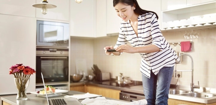 Bild zeigt junge Frau, die mit dem Smartphone Papierdokumente fotografiert.