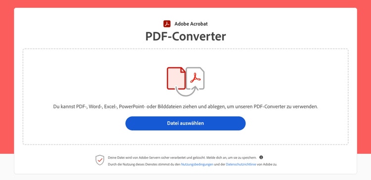 - Öffne den PDF-Converter von Acrobat und klicke auf "Datei auswählen" oder ziehe die Datei in die Dateiablage.