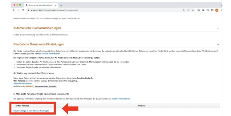 - E-Mail-Adresse einrichten: Scrolle nach unten zu „Persönliche Dokumente-Einstellungen“. Unter „E-Mail-Liste für genehmigte persönliche Dokumente“ kannst du festlegen, von welchen Absendern dein Kindle Dateien empfangen darf. Klicke auf „Neue E-Mail-Adresse hinzufügen“, um deine private Adresse zu genehmigen.